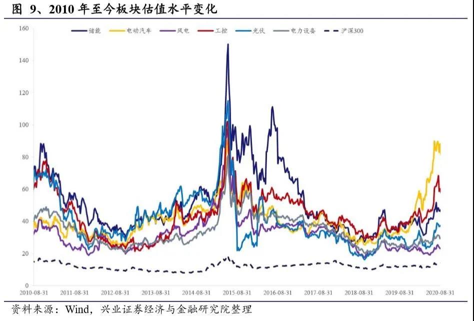 1.2、行业估值比较 截至2020年9月11日,沪深300估值为13.98倍(TTM整体法,剔除负值),储能板块、电动汽车板块、电力设备板块、风电板块、工控板块、光伏板块市估值分别为44.16、78.90、28.50、22.97、55.98、38.30;对于沪深300的估值溢价率分别为2.16、4.64、1.04、0.64、3.00、1.74。