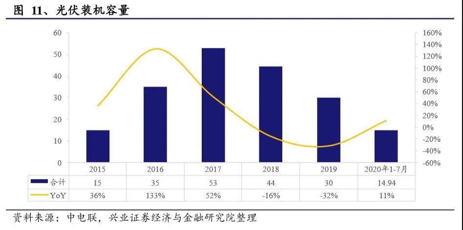2、行业数据跟踪 ●光伏:内需开始释放 2020年1-7月全国光伏新增装机14.94 GW,同比提升11%。国内政策落地,海外需求景气,龙头集中度提升,技术进步成本下降驱动需求。 ![]()