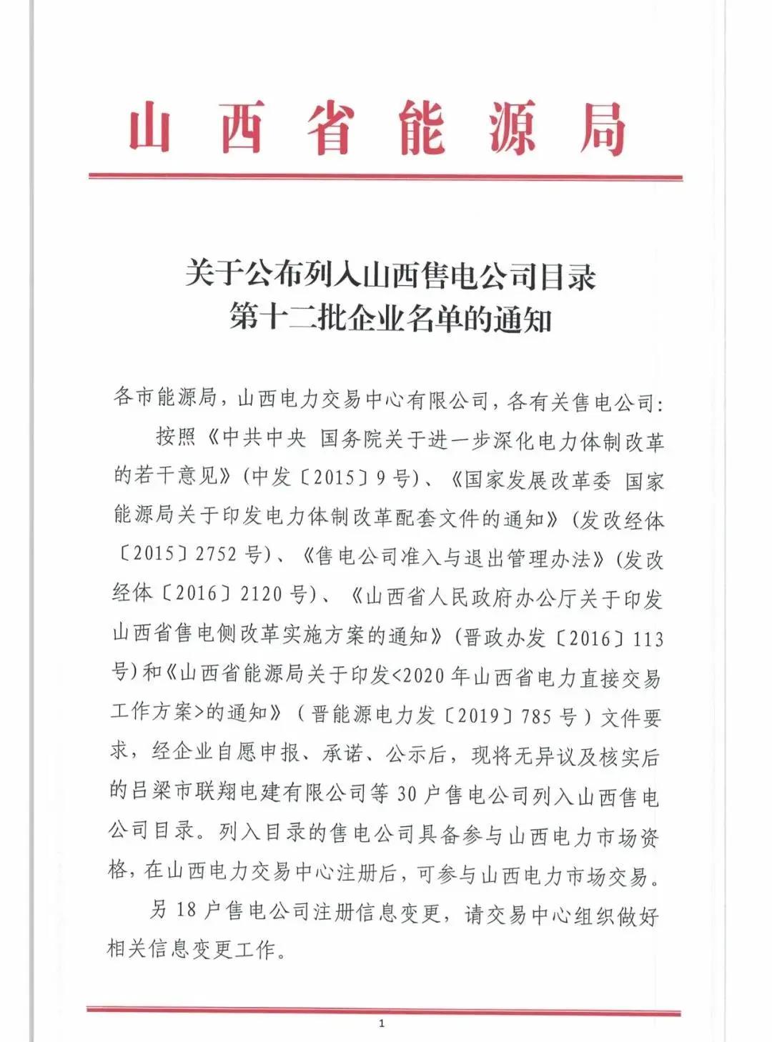 近日,山西省能源局公布列入山西售电公司目录第十二批企业名单,详情如下: